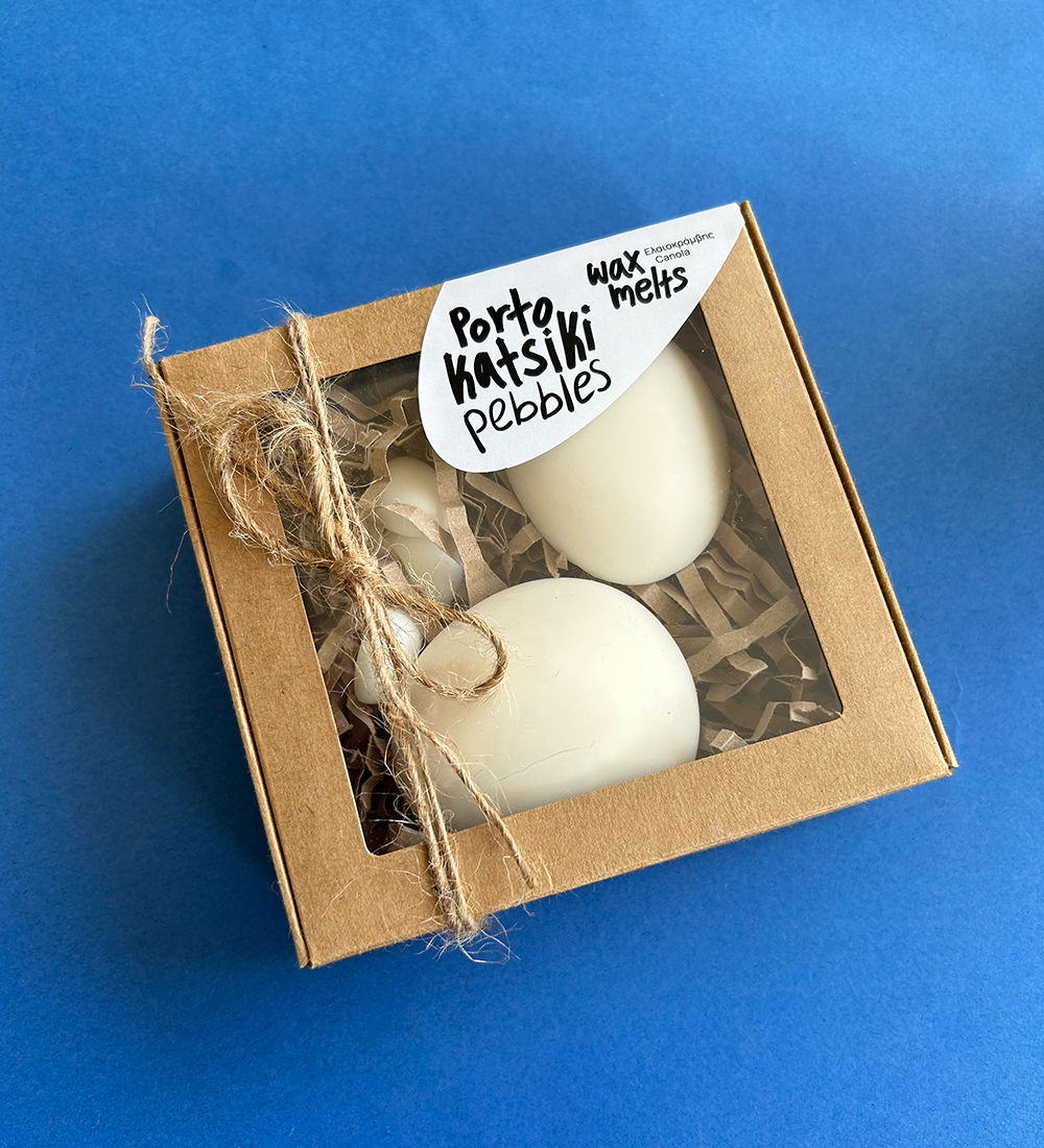 Wax melt ελαιοκράμβρης (100% φυτικό) σε σχήμα βότσαλου (±100gr κεριού στο πακέτο), όπως αυτά τις γνωστής παραλίας, με άρωμα κύματος και θάλασσας.